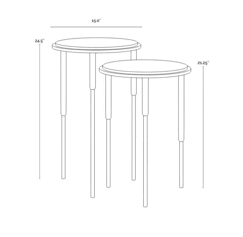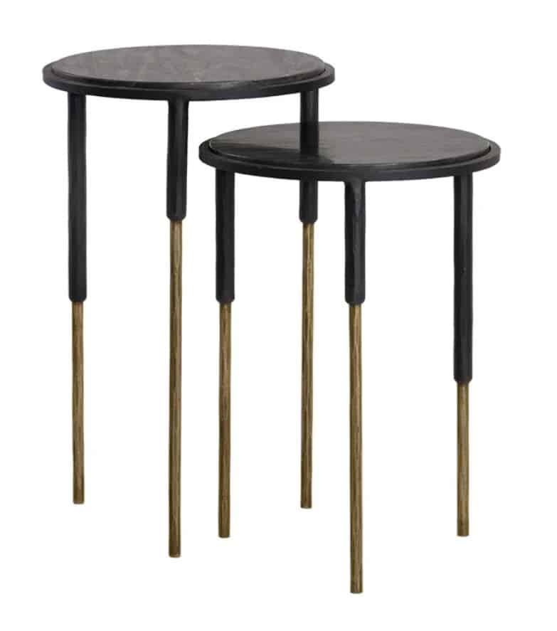 A surreal set of nesting side tables crafted in India. Each table features a dramatic black marble top and hand finished black iron and antique brass legs. Made in India: With refined craftsmanship, this design was brought to life by skilled local artisans. By nature, these materials develop unique imperfections such as fissures, markings and colour variations for a truly one-of-a-kind piece.