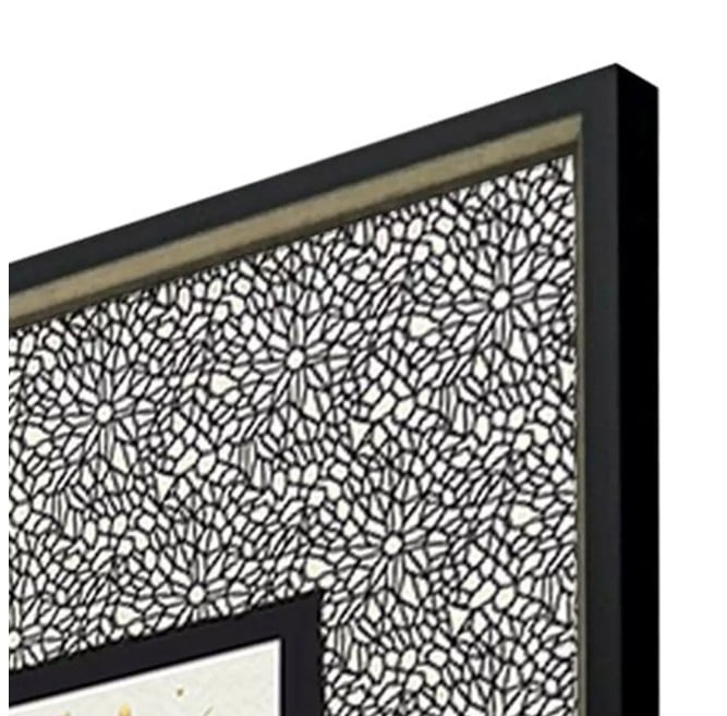Exclusive hand painted with gold leaf on fine art paper and accented with decorative papers. Framed in black painted wood and silver leaf slope.