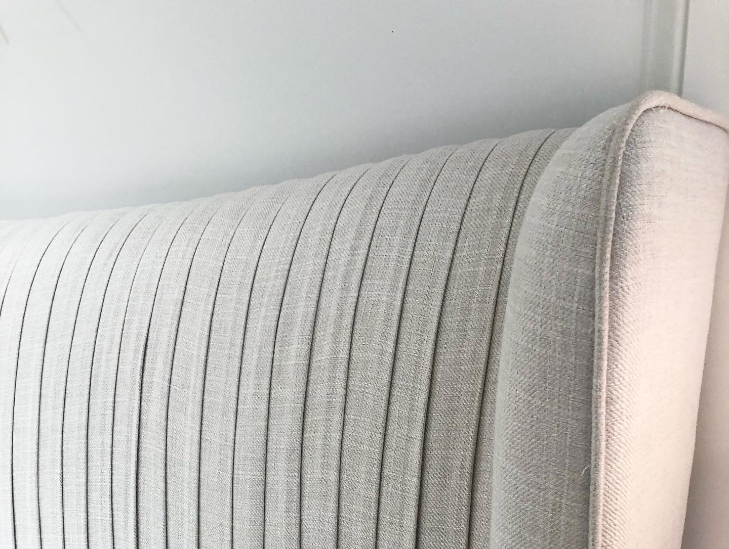 A classic wingback headboard evokes the feeling of an antique piece, presented in a finely tailored ivory upholstery with dove gray legs that suits today’s more streamlined transitional aesthetic. An accent of vertical sewn pleating adds a note of texture to the elegant style of this striking bed. Available in Queen, King.